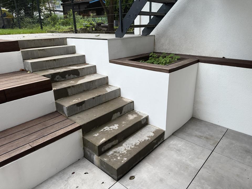 – robuster Terrassenbelag mit Sitzsteinen und aufgehende Treppe zum Garten