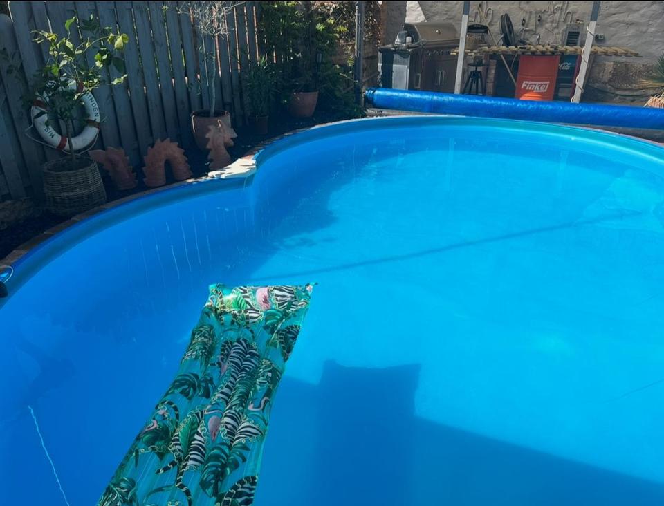 Eine weitere Besonderheit ist der sehr große Hinterhof, der mit einem eingelassenem und ummauerten Pool, einer großen Terrasse und einer bisher genutzten Außenküche ausgestattet ist.