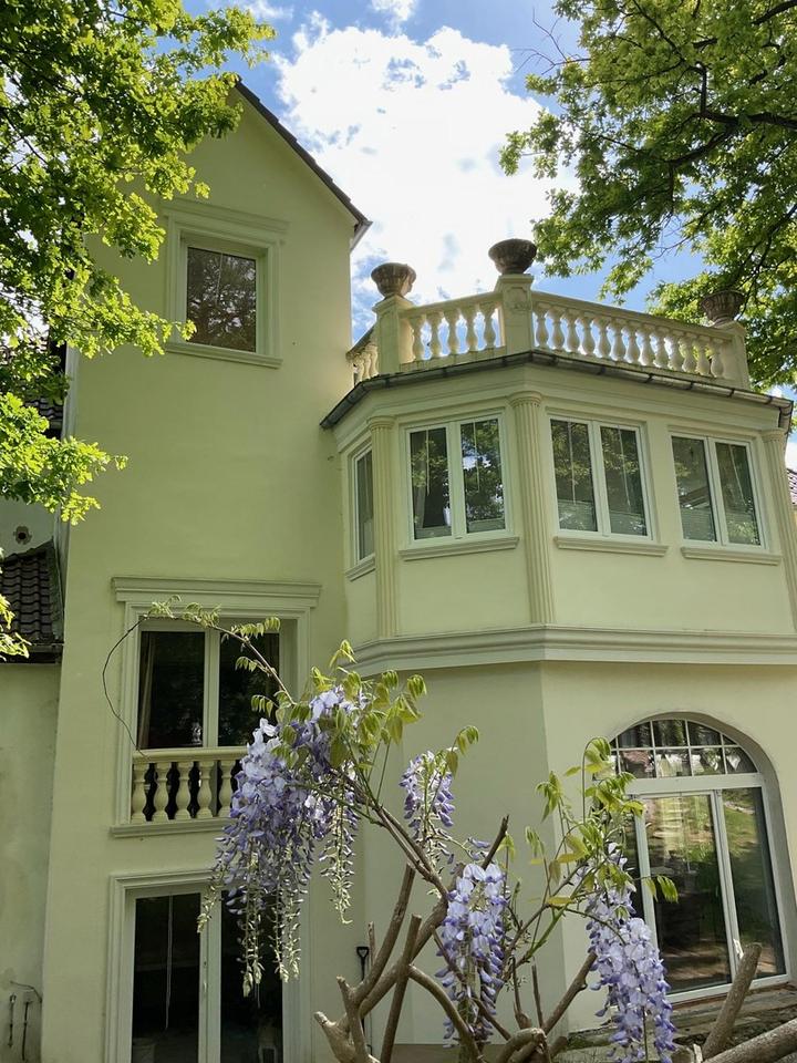 Die denkmalgeschützte Villa verfügt über 17 Zimmer, eine großzügige Küche, 7 Bäder, 2 Gäste-WC, 2 Büroeinheiten, einer Waschküche und Kellerräume.