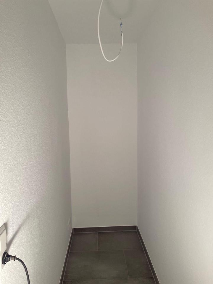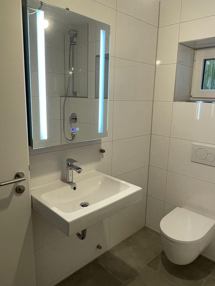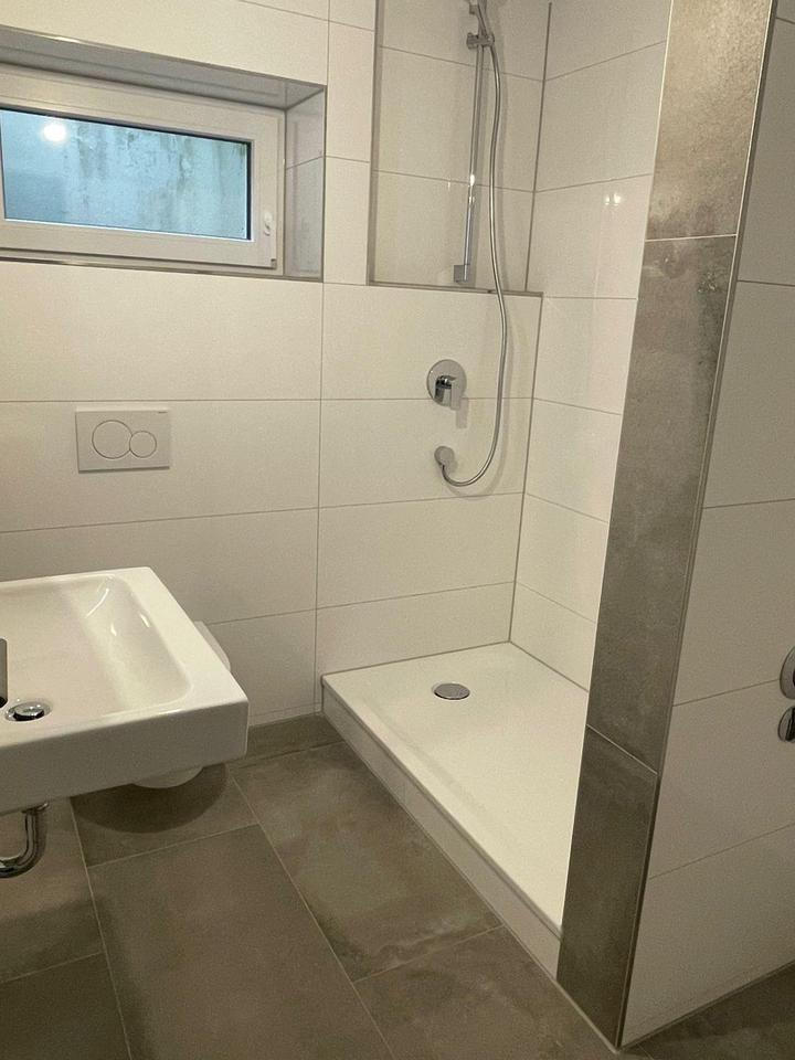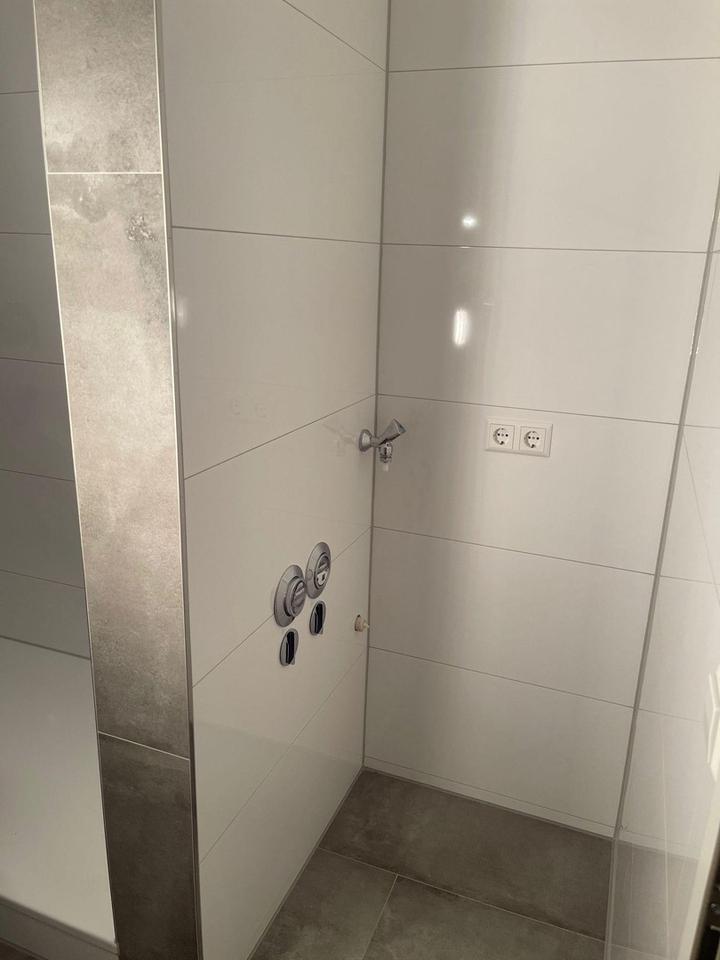 Das Badezimmer ist mit einer großen, bodengleichen Dusche, WC sowie einem Waschmaschinenanschluss ausgestattet.