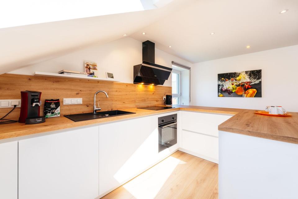 Die voll ausgestattete Küche lässt keine Wünsche offen und ist mit hochwertigen Elektrogeräten, Pfannen, Töpfen, Geschirr und etlichem Zubehör eingerichtet