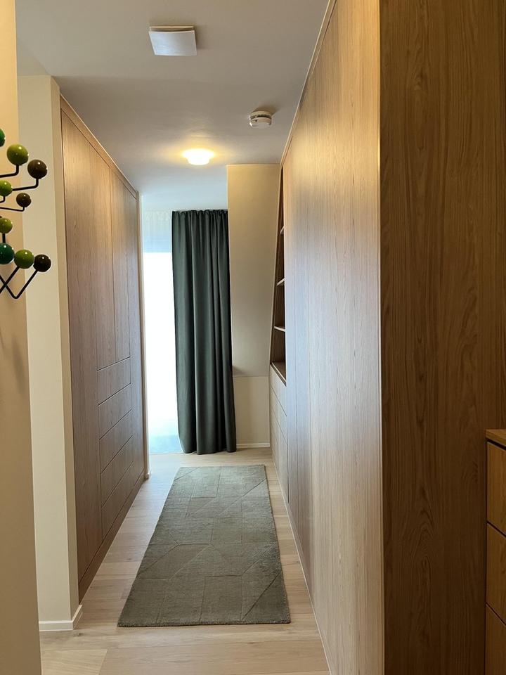 Auf der anderen Seite des einladenden Eingangsbereichs befindet sich der private Bereich mit Schlafzimmer und Balkon sowie Ankleide, Kinderzimmer und einem Tageslichtbad mit Badewanne, Dusche und einem exklusiven, maßangefertigten Corian-Waschtisch. Über eine elegante Treppe gelangt man in der oberen Ebene zu einem ebenfalls voll ausgebauten, zweiten Büro, das durch den vorbereiteten Saunaanschluss auch als Wellnessraum genutzt werden kann.