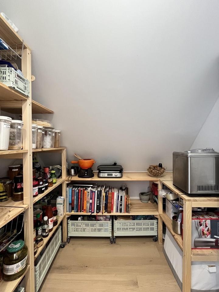 Die untere Ebene wird durch den Eingangsbereich geteilt und bietet auf der einen Seite einen großzügigen Wohn- und Essbereich mit direktem Zugang zur Terrasse, eine offene Küche mit angrenzender Speisekammer sowie ein Tageslichtbad mit Dusche und Waschmaschinenanschluss. Über eine Stahltreppe mit Glasgeländer und Beleuchtung gelangt man in das voll ausgebaute Büro bzw. Gästezimmer mit separatem Abstellraum, der ausreichend Platz für einen begehbaren Kleiderschrank bietet.