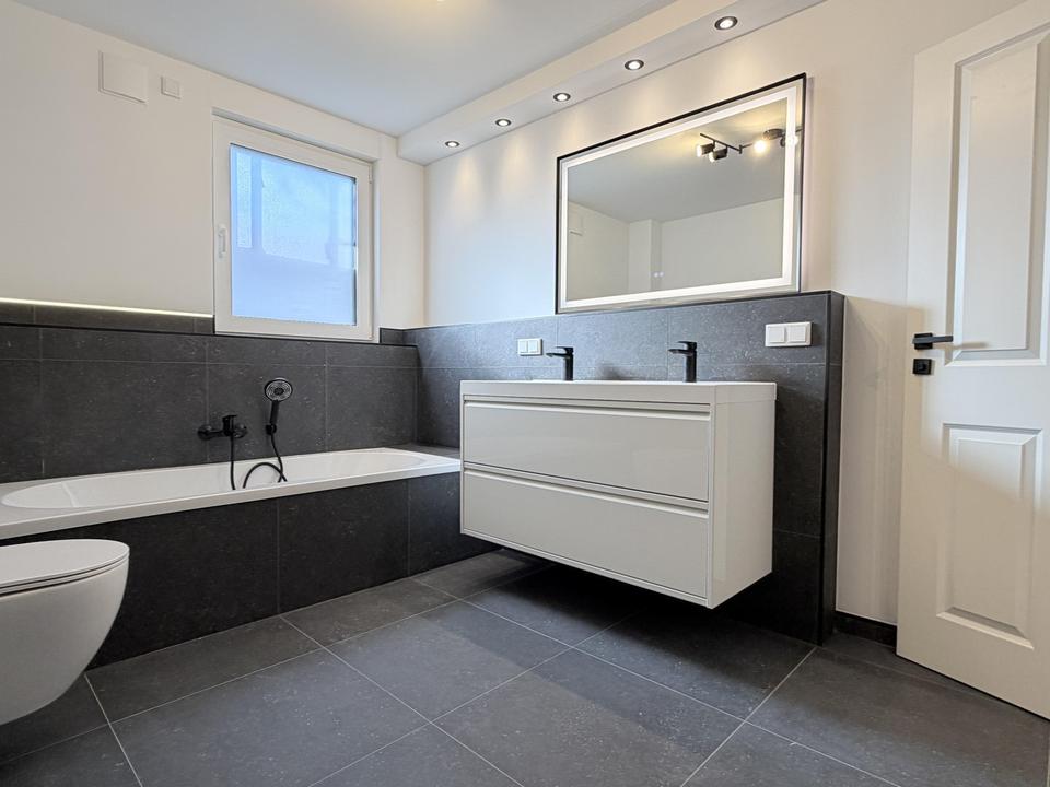 – Tageslichtbad mit modernen hochwertigen Fliesen, Fußbodenheizung und Sanitärgegenstände (Dusche, Doppelwaschbecken mit Hochglanzunterschrank, Hänge-WC, Armaturen Inklusive LED-Badspiegel mit Anti-Beschlag Funktion und Beleuchtung).