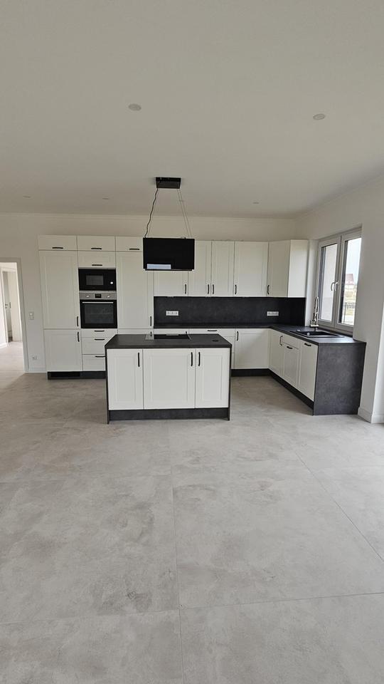 Die Küche ist mit Geräten ausgestattet, darunter eine Kühl-/ Gefrierkombination, Einbau-Mikrowelle, Geschirrspülmaschine, Backofen, Herd, Inselhaube.