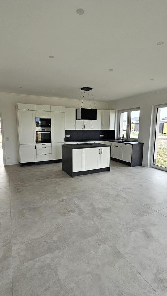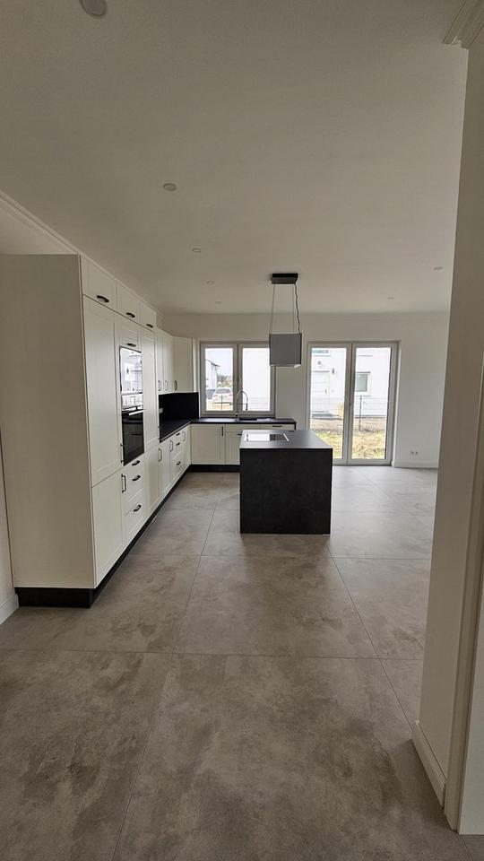 Wohnen & Kochen: Der helle, großzügige Wohnbereich ist mit einer Einbauküche sowie einer Kochinsel ausgestattet.