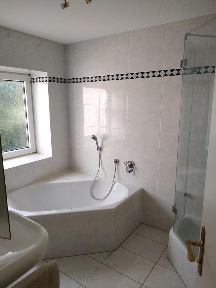 Mit Betreten der Wohnung im ersten Obergeschoss befinden Sie sich in einer kleinen Diele mit Eichenparkett, von der rechts das kleine, hell deckenhoch geflieste Duschbad mit Toilette und Waschtisch abzweigt, mit integriertem Spiegel, Duschkabine sowie Beleuchtung.