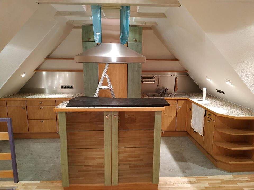 Integrierte Arbeitsplattenbeleuchtung und Kranzbeleuchtung an der Einbauküche.