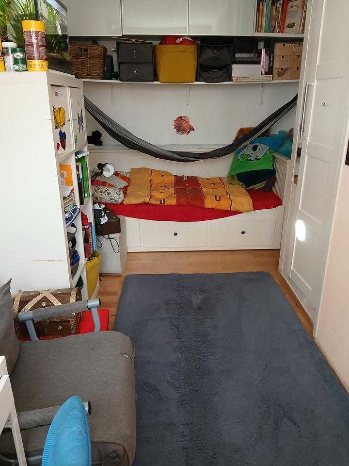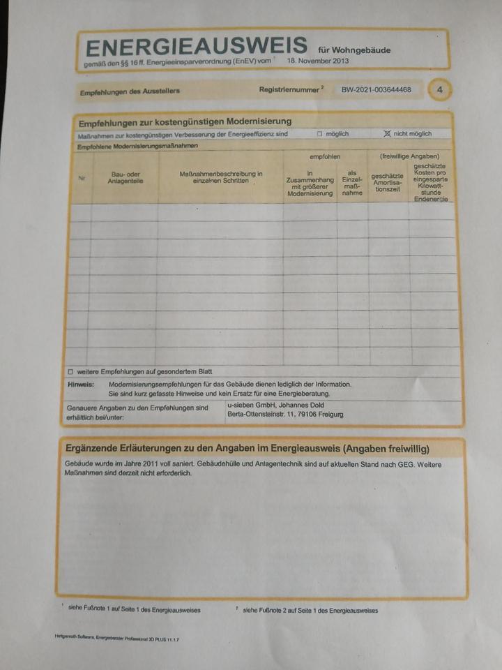 Das Gebäude und die Wohnung wurden im Jahr 2011 voll saniert. Gebäudehülle und Anlagentechnik sind auf aktuellen Stand nach GEG. Weitere Maßnahmen sind derzeit nicht erforderlich. Ein Schlafzimmer ist für zwei Kinder geteilt worden mit eigener Faltklapptür und fest eingebauten Wandschrank versehen worden. Kann übernommen oder bei Bedarf entfernt werden.
