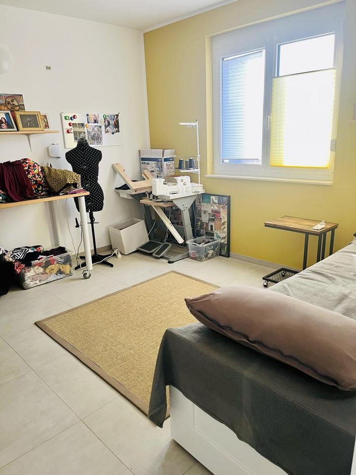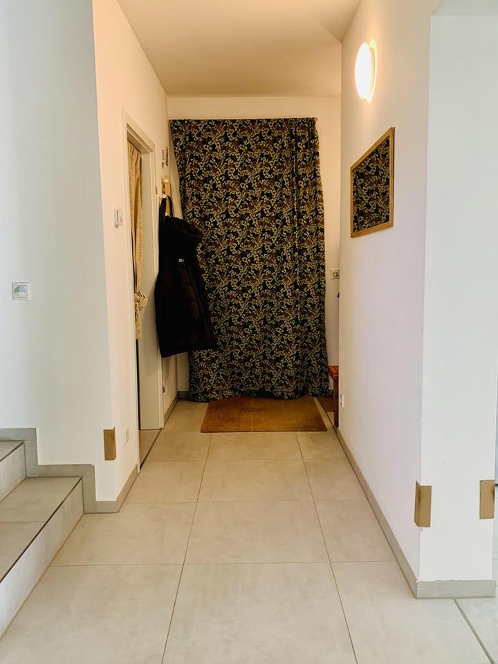 Im Inneren überzeugt das Haus durch eine moderne, offene Raumgestaltung. Im Erdgeschoss befinden sich ein Hauswirtschaftsraum, ein Gäste-WC, die Küche mit Einbauküche aus dem Jahr 2021 und der großzügige Wohn- und Essbereich, der direkten Zugang zur Terrasse bietet. Ein praktischer Abstellraum unter der Treppe ergänzt das Platzangebot. Im Obergeschoss liegen das Schlafzimmer, ein Kinderzimmer, ein Büro sowie das Badezimmer mit ebenerdiger Dusche und Badewanne. Alle Räume sind einheitlich mit großen, modernen Fliesen ausgestattet. Ein zusätzlicher Dachboden bietet weiteren Stauraum.