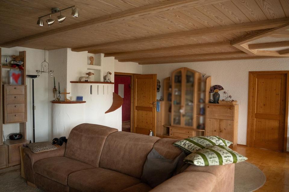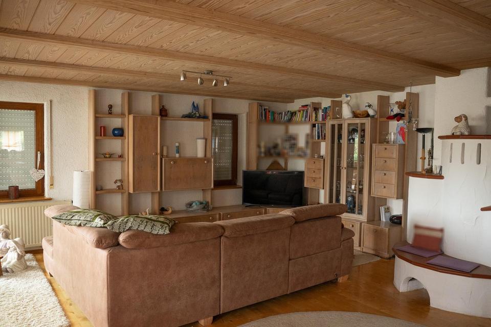 – Erdgeschoss (ca. 150 m²): Mittelpunkt ist der Wintergarten, angrenzend ein großes Wohnzimmer mit gemauertem Kachelofen samt Sitzbank (Einsatz 2019 erneuert). Von der sonnigen Terrasse genießen Sie einen traumhaften Ausblick und den gepflegten Garten.