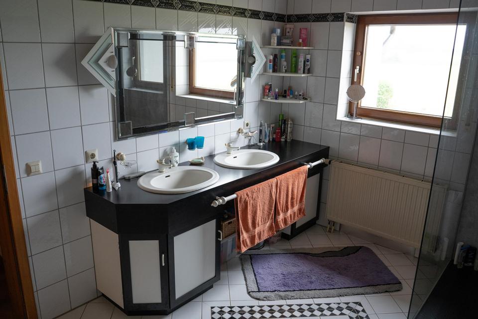 – Untergeschoss: Zwei helle Zimmer mit direktem Zugang in den Garten, WC, Hobbyraum (Anschluss für Dusche vorhanden), Abstellraum sowie eine voll unterkellerte Doppelgarage mit Werk- und Holzraum.