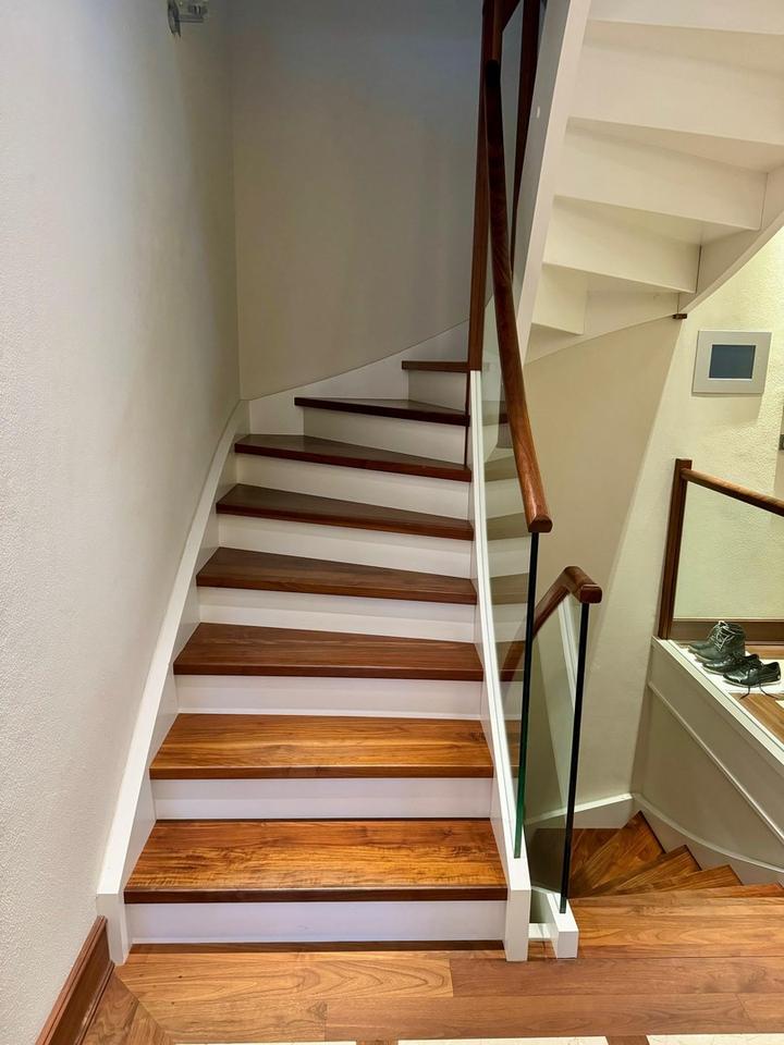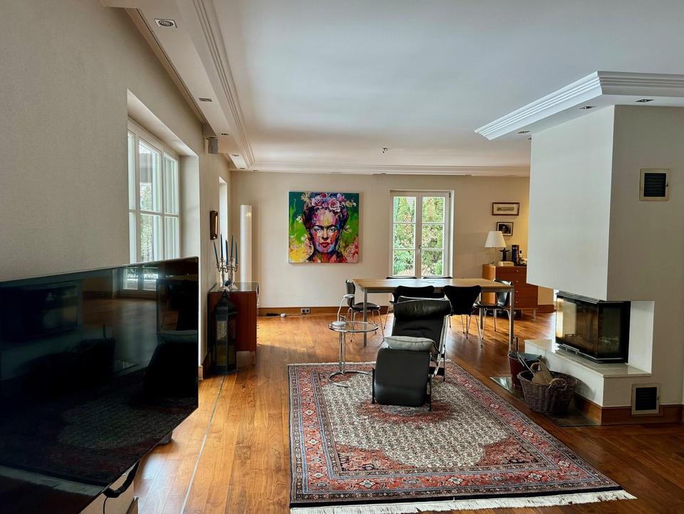 Die aufwändige Haustechnik umfasst Netzwerkverkabelung, Soundanlage in EG und Souterain, integrierte LED-Beleuchtung, elektrische Jalousien, Gasheizung plus Wärmepumpe und eine hochwertige Alarmanalage. Die Parkettböden sind aus amerikanischem Nussbaum, die Bäder aus hellem Marmor. Die Zimmer im 1. OG sind mit maßangefertigten Einbauschränken ausgestattet. Die Wohnung ist optimal gepflegt. Ideal für eine große Familie bzw. Freiberufler.