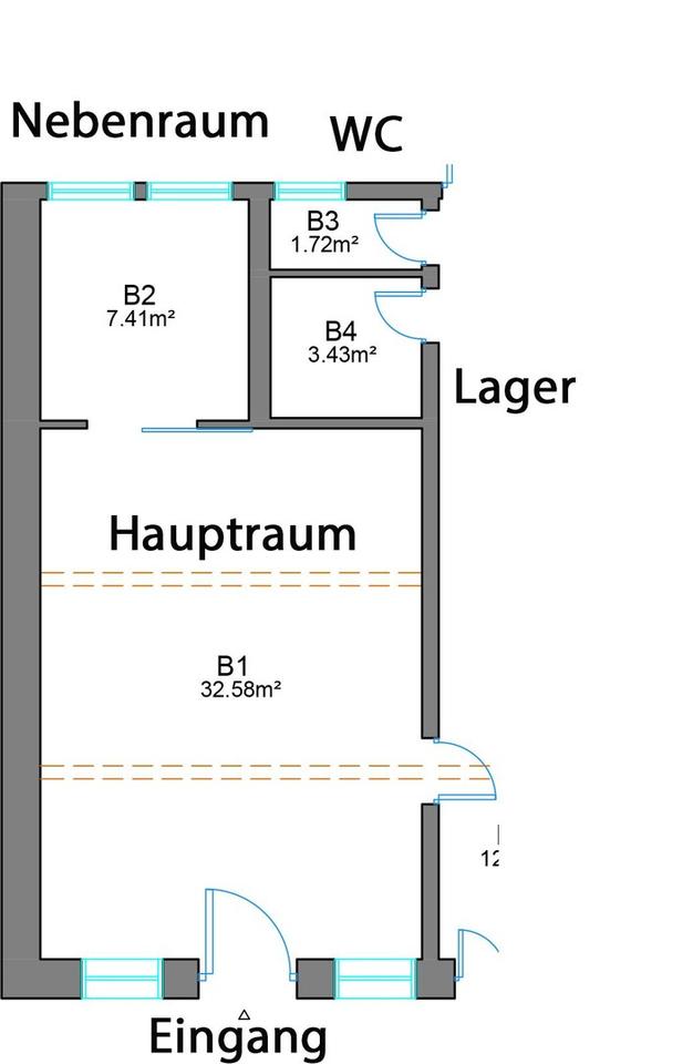 Die Raumaufteilung umfasst einen großzügigen Hauptraum (ca. 35 m²), ein separates Nebenzimmer sowie ein Lager und einen eigenen Sanitärbereich.