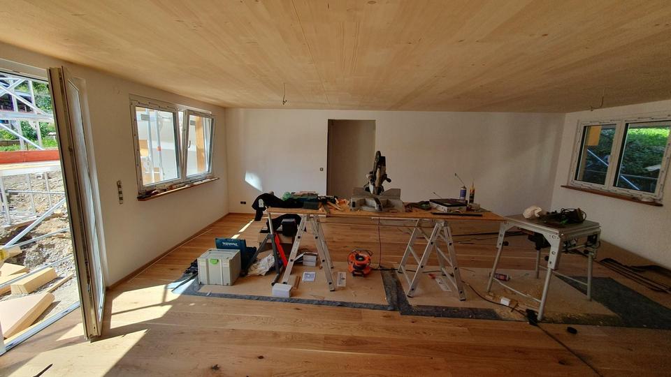 – Böden: Echtholzparkett in Wohnräumen, großflächige Fliesen in Bädern
