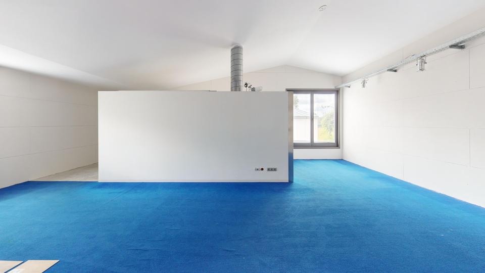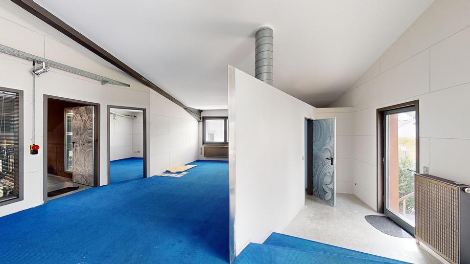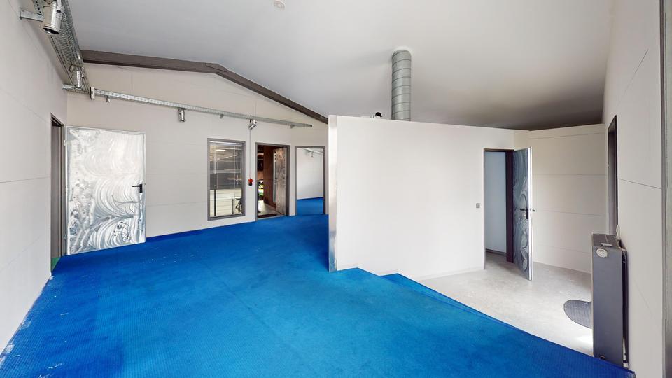 Halle im Erdgeschoss: ebenerdige Autoeinfahrt, ursprünglich als Fotostudio genutzt – stilvoller Industrie-Loft-Charakter mit ehemals vollverglaster Nordseite (wiederherstellbar nach Bedarf). Perfekt für Hobby, kleine Produktionen, Lager, Ausstellungen oder Veranstaltungen.