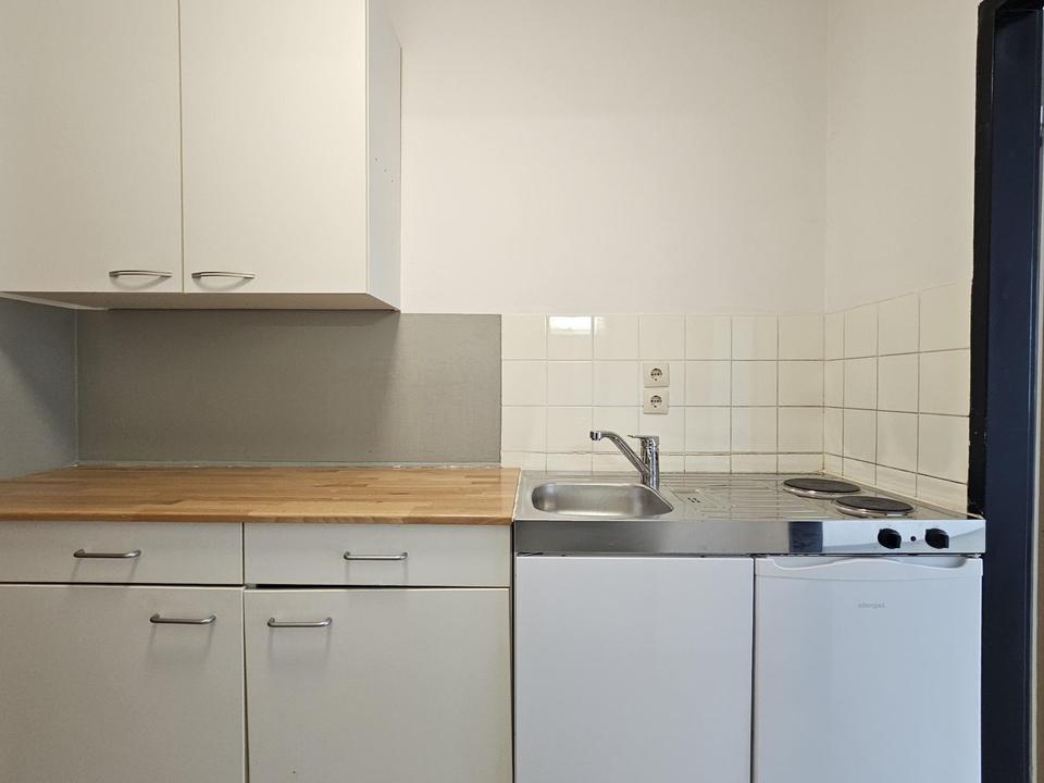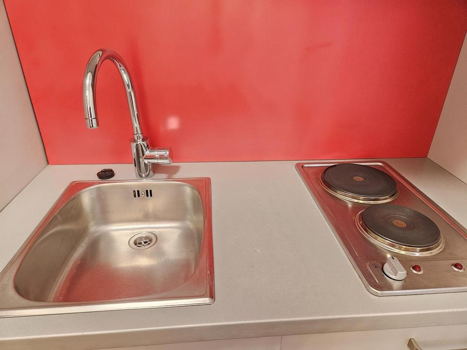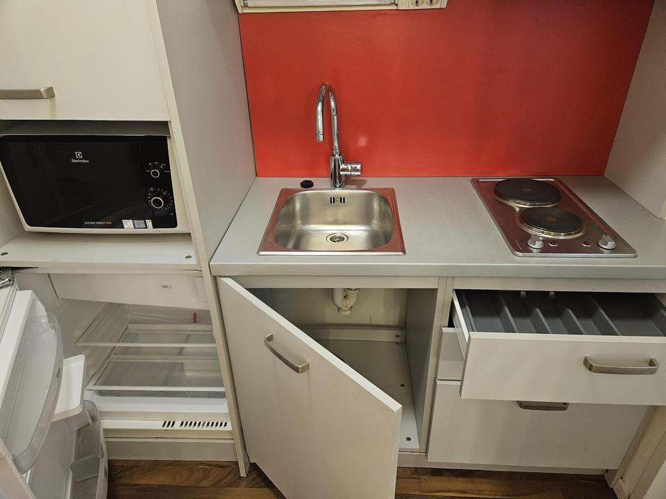 Es gibt eine Einbauküche mit 2 Elektroplatten, Kühlschrank und Schränken. KEIN Backofen und KEINE Spülmaschine.