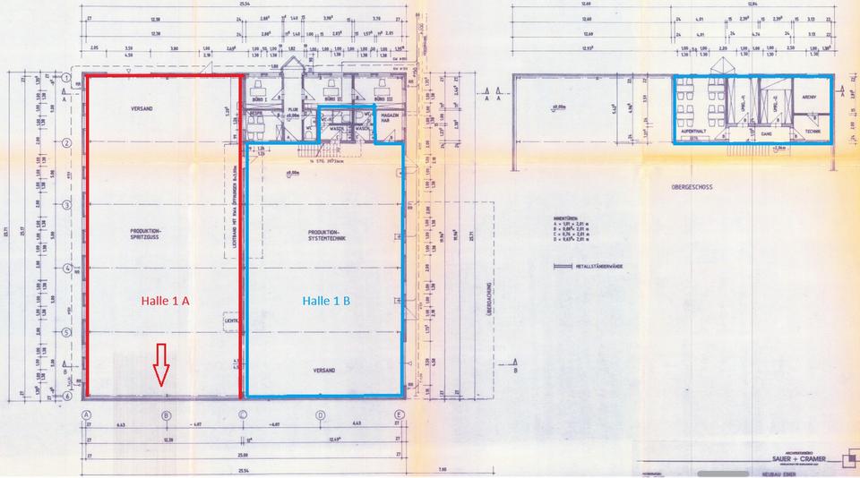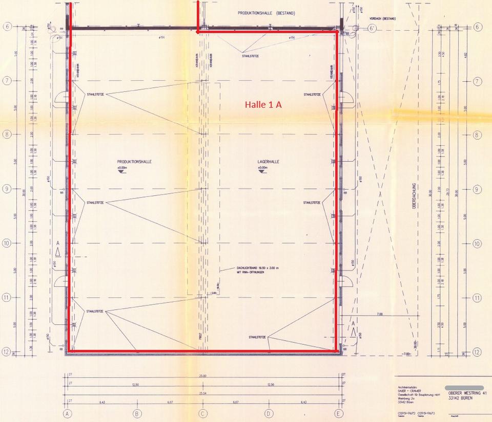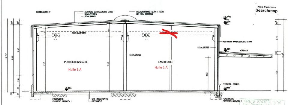Halle 1: (zur besseren Orientierung – rote Stahlkonstruktion)