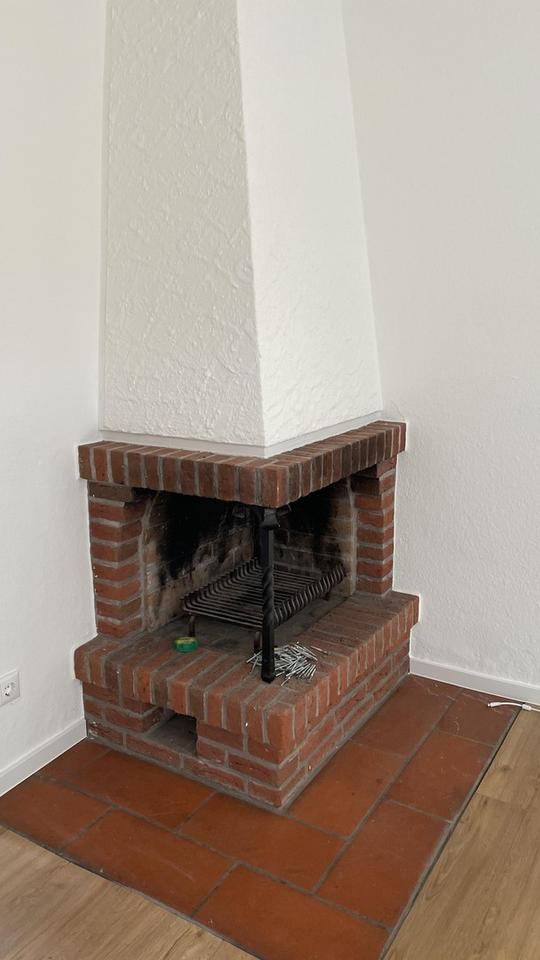 Das gemütliche Wohnzimmer mit Essecke und offenen Kamin lädt zum Verweilen ein. Es gibt eine großzügige Terrasse. Ein Gäste-WC ist auch vorhanden.
