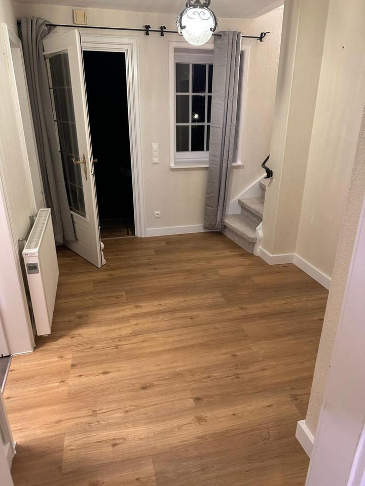EG: Wohnzimmer mit Kamin, Küche, Flur, Gäste-WC, Schlafzimmer zum Osten mit einem Duschbad und Abstellraum mit Kellerzugang; neuer Laminatfußboden im EG , Treppenaufgang