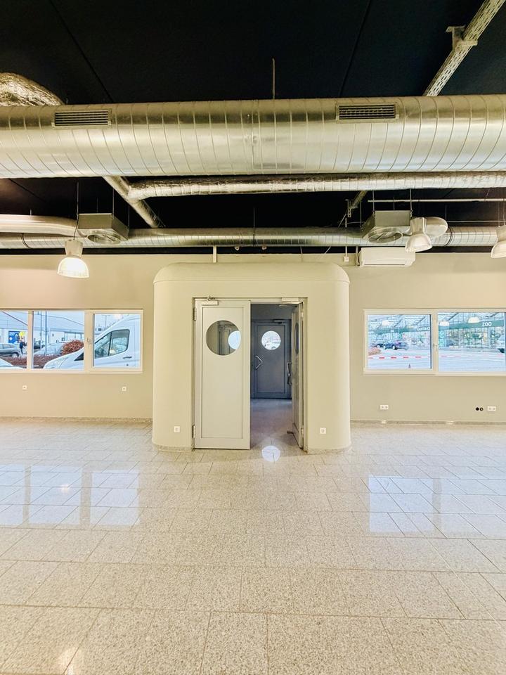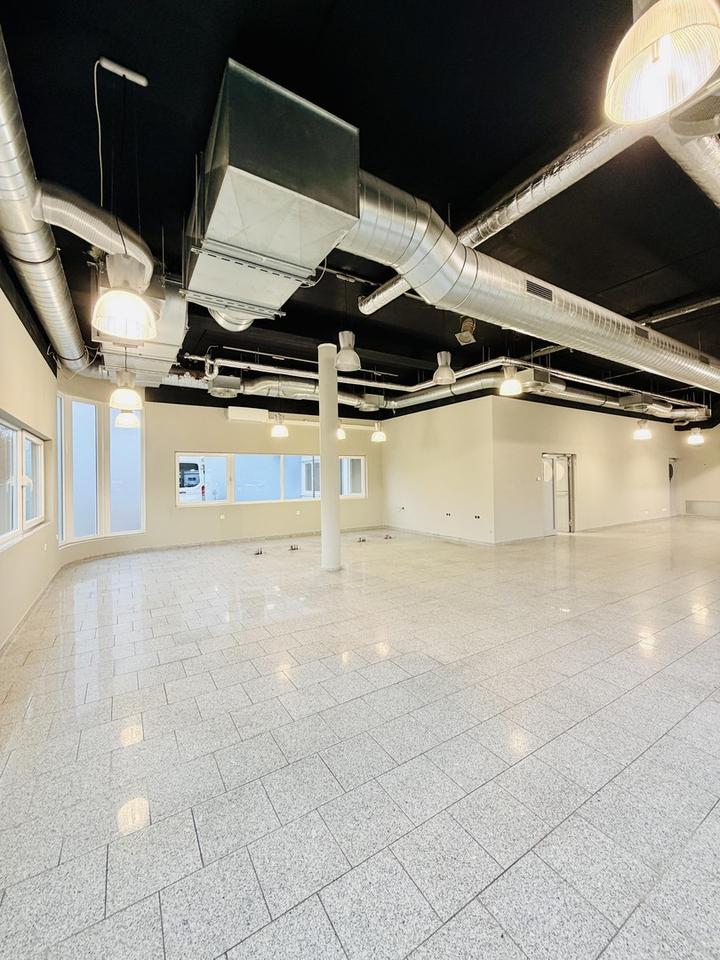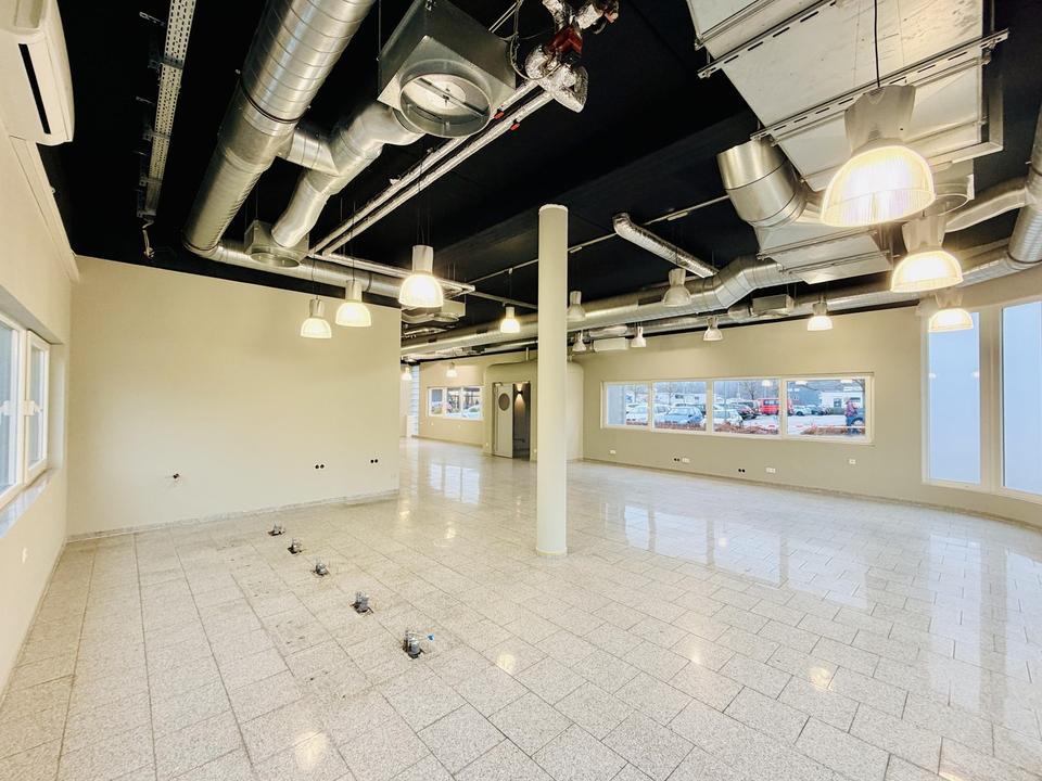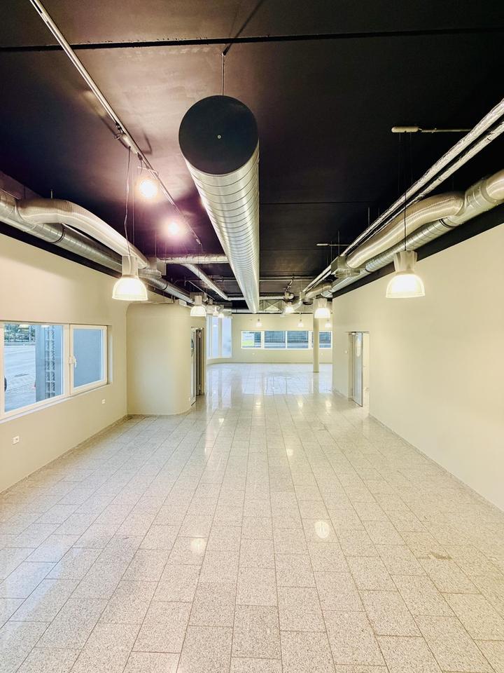 Der großzügige Verkaufsraum ist hervorragend geschnitten und dank der umlaufenden, großflächigen Fensterfronten vollständig lichtdurchflutet. Die hohen Decken sorgen für ein außergewöhnlich angenehmes und loftartiges Raumgefühl, während der edle Granitboden dem Objekt eine hochwertige und zeitlose Optik verleiht. Für zusätzlichen Komfort ist der Verkaufsraum klimatisiert.
