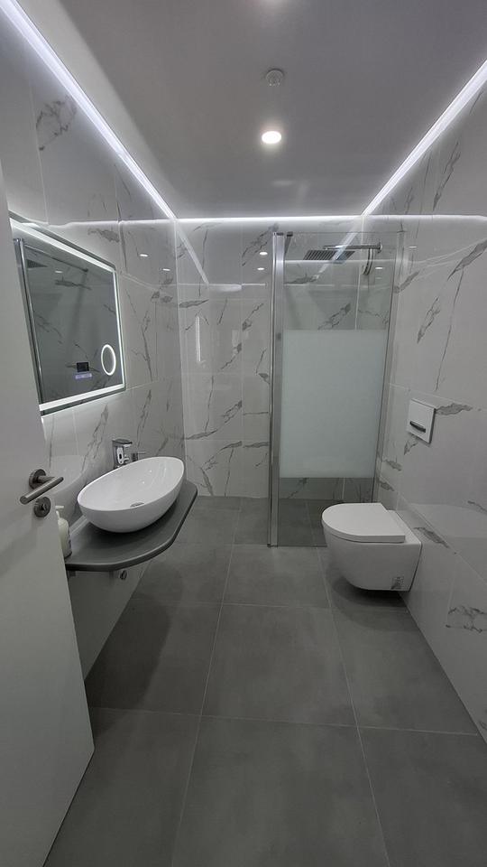 Es werden ausschließlich Markenprodukte verwendet, darunter Hager, Grohe, Hansgrohe, Geberit, Tece, Shelly, Jung usw.