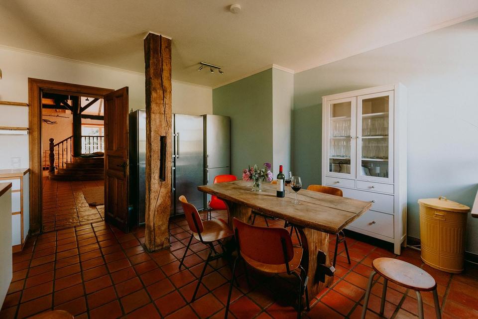 Das Anwesen verfügt über ein traditionelles Reetdach, das über die Jahre laufend gepflegt und teiweise sogarbereits erneuert wurde. Eine moderne Pellets-Heizungsanlage (2025) versorgt das gesamte Haus zuverlässig, auch bei Vollbelegung. Die Innenausstattung ist geprägt von natürlichen Materialien, sichtbarem Ständerwerk und einer warmen, ursprünglichen Raumwirkung.