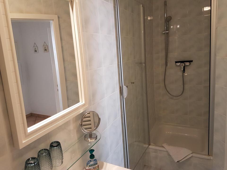Im Wohn,- und Essbereich, in der Küche, den Bädern und im Flur ist der Boden mit Fliesen versehen. Die beiden Schlafzimmer haben einen Laminatboden. Die Wohnung verfügt über eine Fußbodenheizung und zusätzliche Heizkörper. Auf die große Dachterrasse, die beeindruckende 60 qm groß ist, gelangen Sie über eine Innentreppe. Dort gibt es genug Platz, um zu grillen und Sonnenliegen aufzustellen. Die Einbauküche und alle Geräte sind im Kaufpreis enthalten. Nach Absprache können auch einige Möbel übernommen werden.