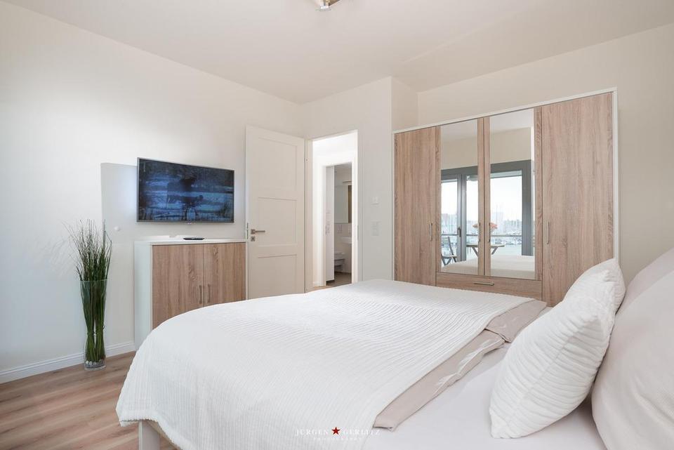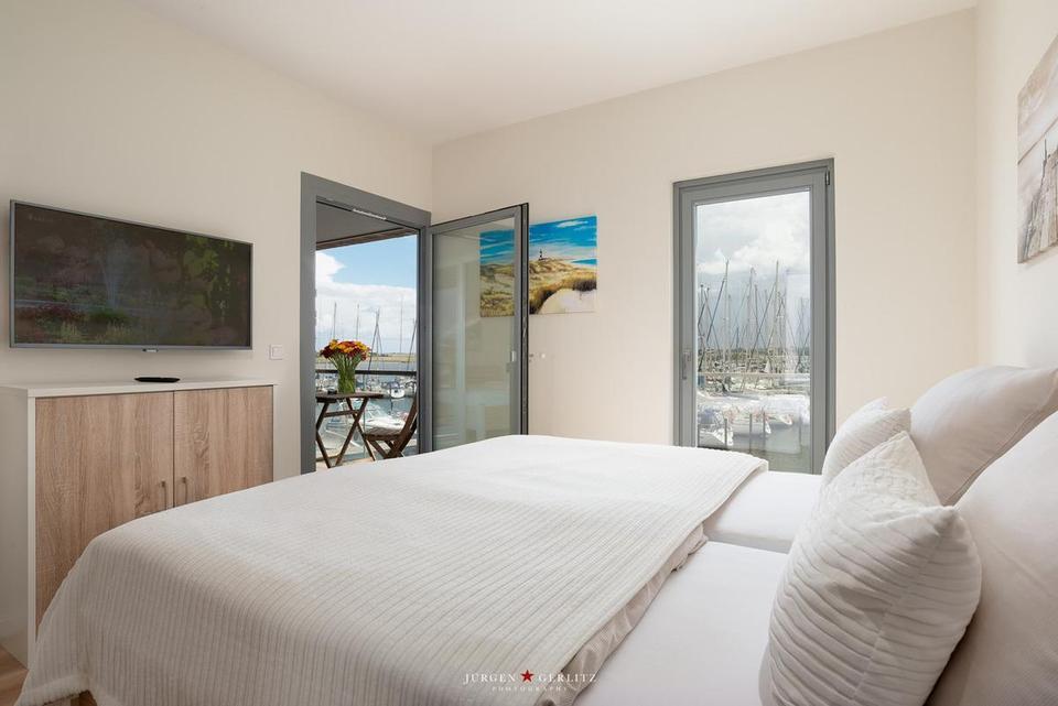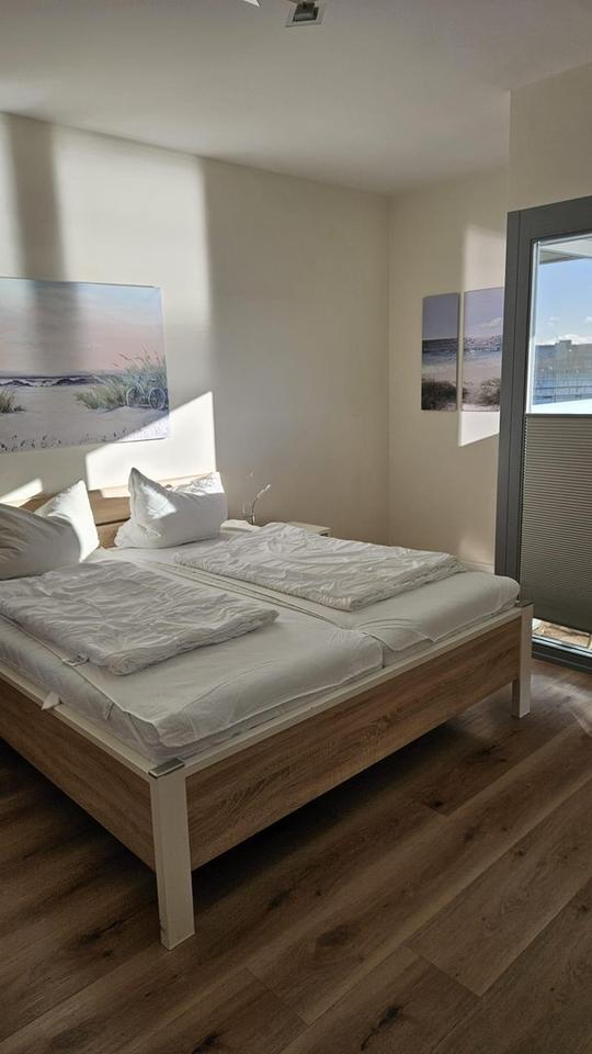 •Obergeschoss – Ruhe & Wellness: Die obere Etage ist Ihre ganz persönliche Rückzugsoase. Beide Schlafzimmer verfügen über bodentiefe Fenstertüren mit direktem Zugang zur überdachten Loggia – auch hier genießen Sie den Blick über die Masten der Yachten hinweg auf das Wasser. Die Zimmer sind mit einem stylischen Boden in Holzoptik ausgestattet. Das Highlight im Obergeschoss ist das Master-Bad: Neben einer großzügigen, bodentiefen Dusche erwartet Sie hier eine eigene Sauna – Luxus pur für entspannte Stunden nach einem Strandspaziergang. Ein zusätzlicher Abstellraum sorgt für Ordnung.