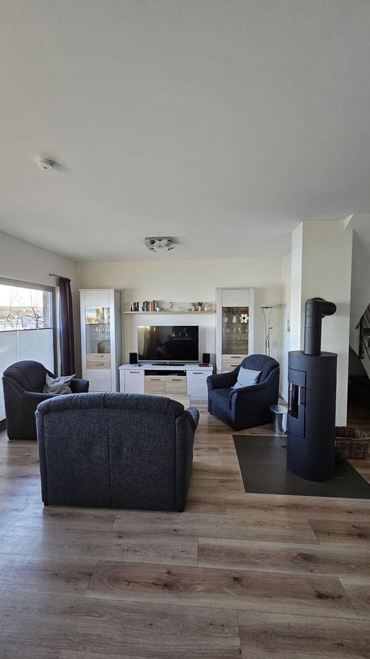 Das Wohnzimmer bietet Platz für eine großzügige Sitzlandschaft. Ein besonderes Highlight ist der installierte Kamin, der an kühlen Ostseeabenden für eine unvergleichliche Wohlfühlatmosphäre sorgt.