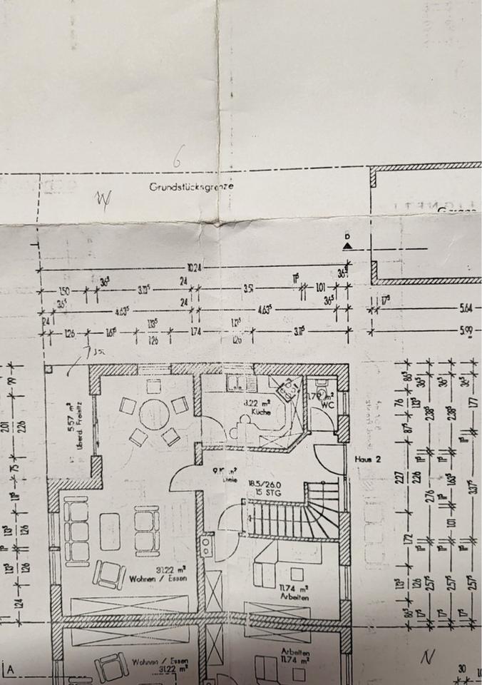 EG: Flur, Gäste-WC, Wohn- Esszimmer, Küche, Büro, Terrasse
