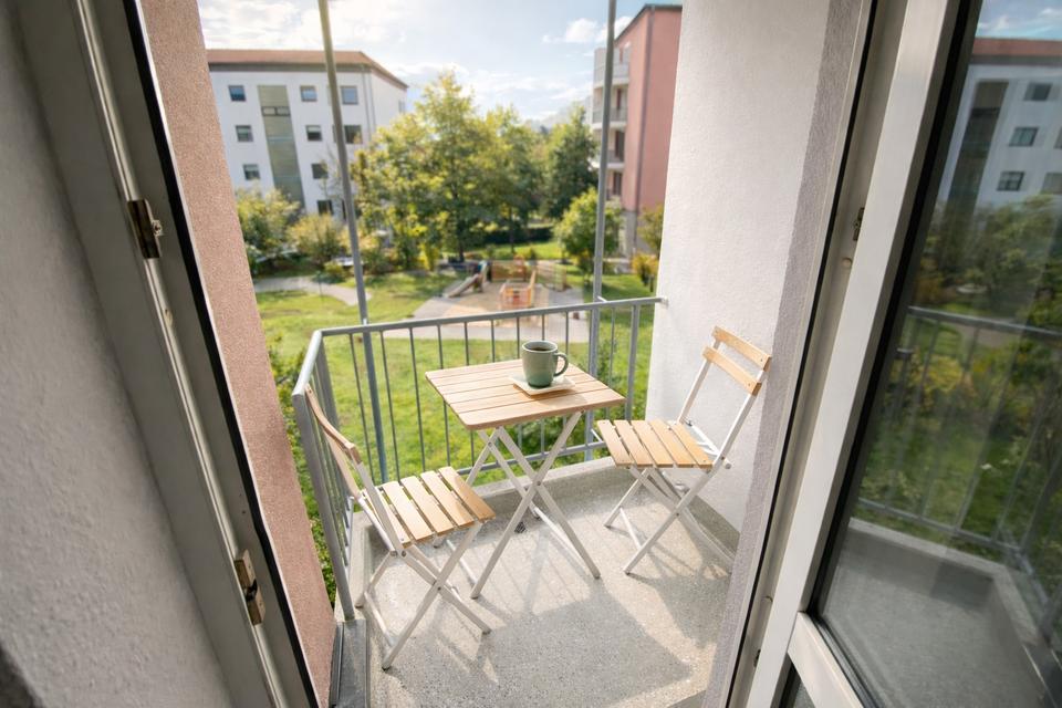 Die Wohnung befindet sich im gepflegten fünfgeschossigen Wohn- und Geschäftshaus aus dem Jahr 1992 mit Aufzug. Dank der umfassenden Modernisierung in 07/2025 präsentiert sich das Appartement in zeitgemäßem Zustand: neuer Laminatboden, frisch gestrichene Wände, neue Türen, modernisiertes Bad und ein ruhiger Balkon mit Blick in den grünen Garten! Der helle Wohn-/Schlafbereich sorgt für ein freundliches Raumgefühl.