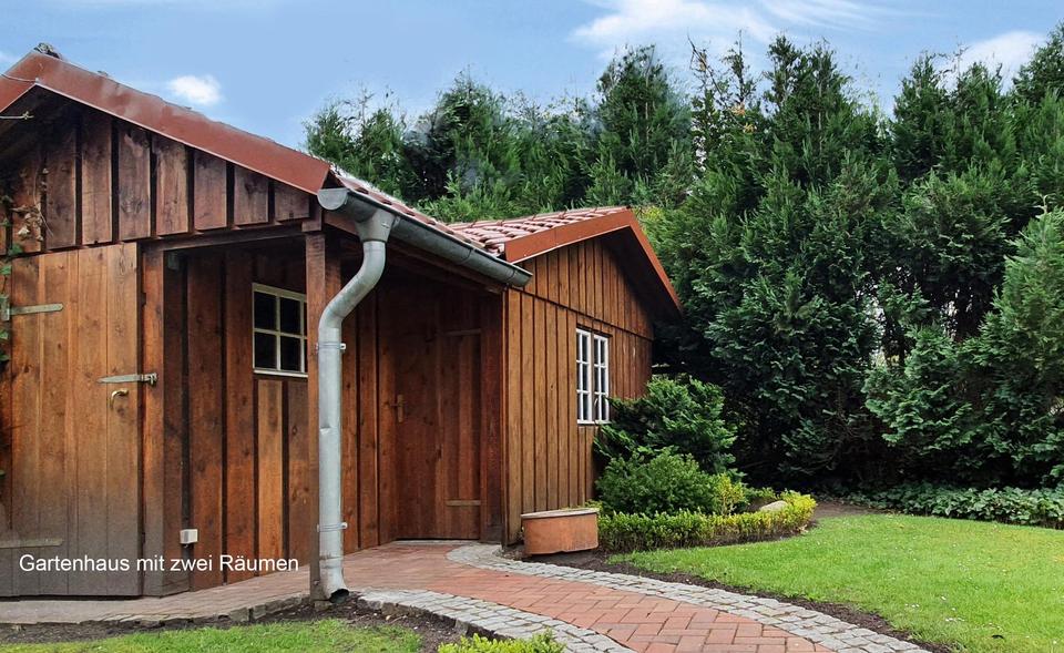 Im hinteren Bereich der Villa ist ein traumhafter Garten angelegt worden. Desweiteren befinden sich dort ein kleiner Pavillon, eine Garage mit zwei Räumlichkeiten und ein Gartenhaus mit zwei Räumen. Für den hinteren Bereich liegt uns zudem ein positiver Bauvorbescheid mit Restriktionen vor.