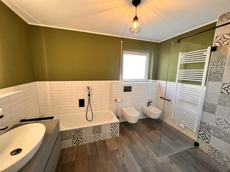 Bad mit bodengleicher Dusche, Badewanne und Bidet