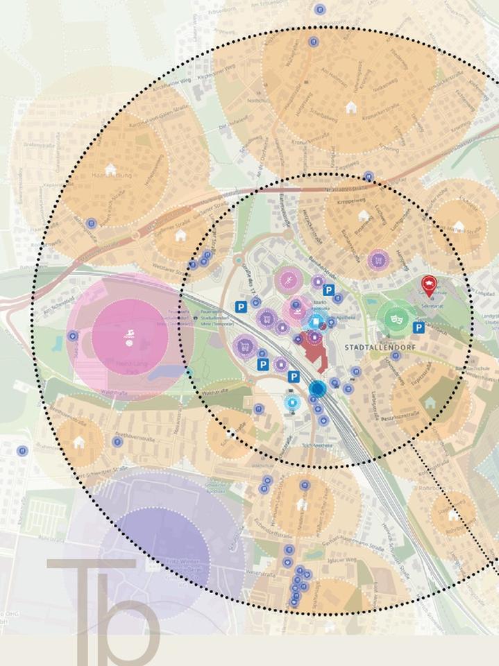 Apotheke, Lebensmittel-Discount, Allgemeinmediziner, Kindergarten, Öffentliche Verkehrsmittel
