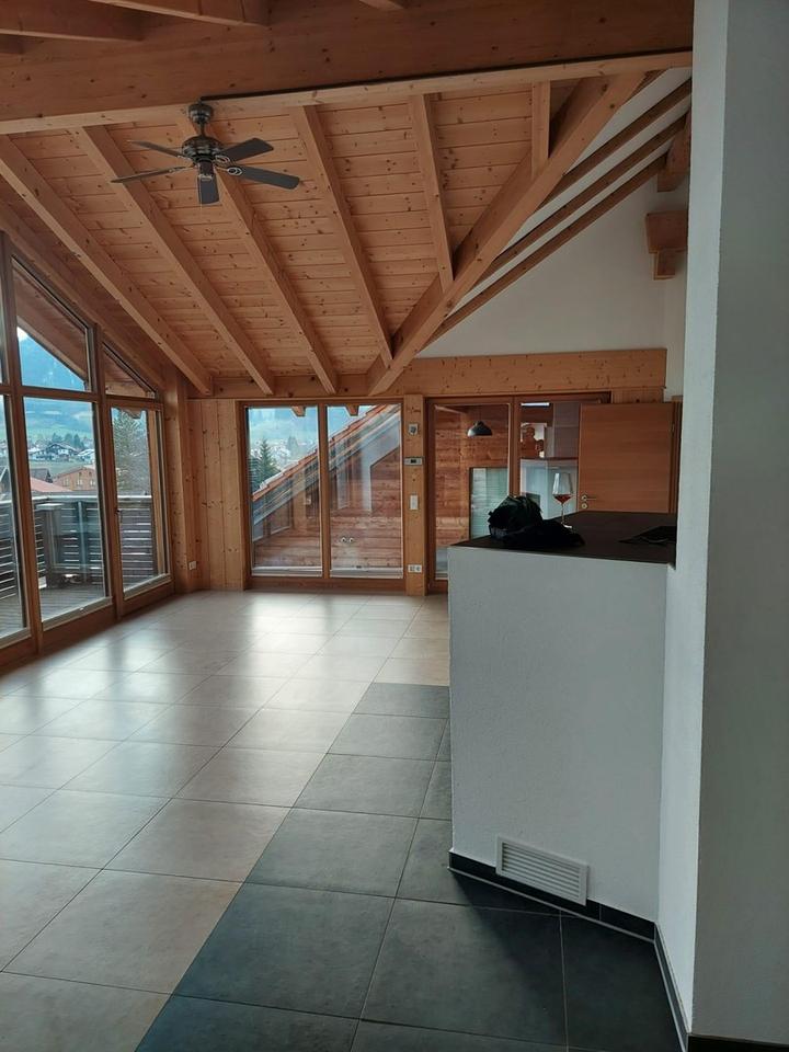 Die Wohnung überzeugt durch eine gelungene Kombination aus modernem Ausbau und alpinem Charakter. Sichtbare Holzbalken, hochwertige Bodenbeläge sowie mehrere modern gestaltete Badezimmer verleihen den Räumen eine besondere Wohnqualität. Die Einbauküche ist zeitgemäß ausgestattet und fügt sich harmonisch in das offene Wohnkonzept ein. Große Fenster und Dachflächenfenster sorgen für viel Tageslicht und einen freien Blick auf die umliegende Berglandschaft.