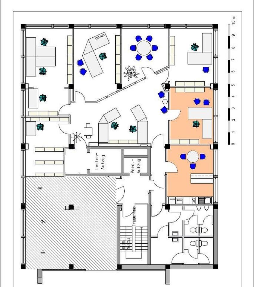 Aufgeteilt ist das Büro einem großen Empfangsraum, 4-6 Büroräumen sowie einem Aufenthaltsraum mit Küche .