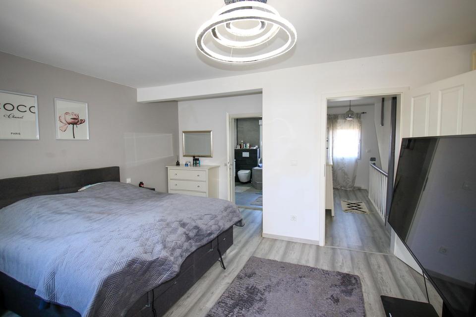 Im Obergeschoss finden Sie das großzügige Schlafzimmer, das Ihnen einen ruhigen Rückzugsort bietet. Ein hochwertig ausgestattetes Bad mit Dusche und Whirlpool lädt zum Entspannen ein. Zudem gibt es einen Zugang zum Balkon, der perfekt geeignet ist, um bei einer Tasse Kaffee die Morgenstunden zu genießen.