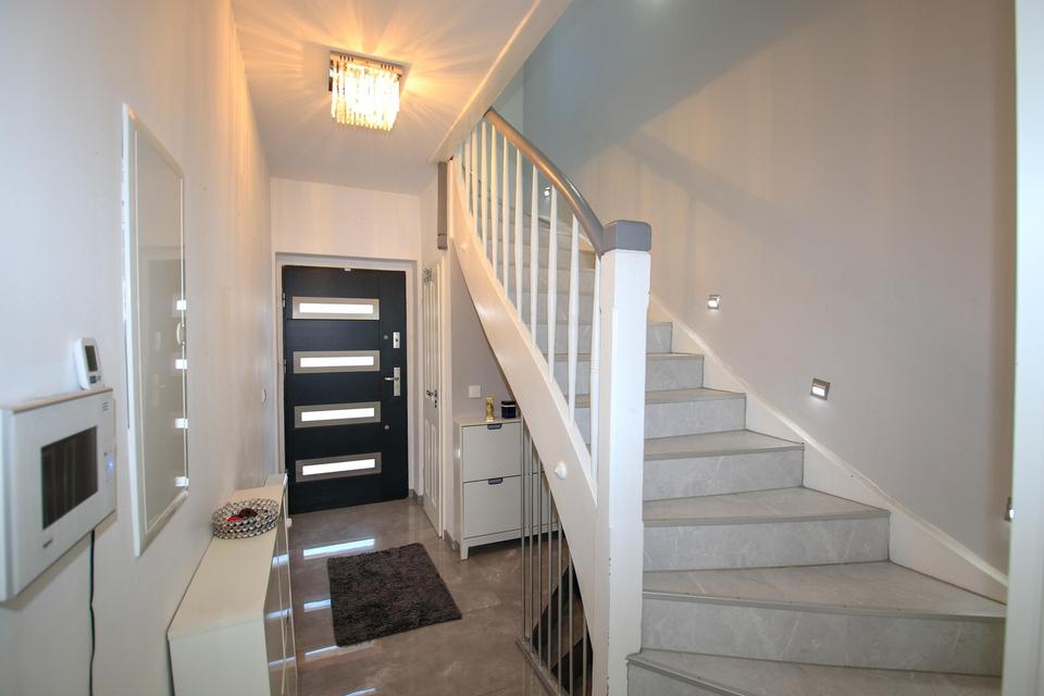 Das gesamte Haus ist mit edlen Fliesen und Laminat ausgelegt, während alle Fenster aus Kunststoff gefertigt sind und ebenfalls elektrische Rollläden bieten. Für angenehme Temperaturen sorgen drei Klimasplitgeräte, jeweils eines pro Etage. Ein Wasserenthärtungsgerät rundet die hochwertige Ausstattung ab.