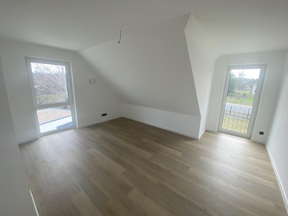 Über eine massive Buchenholztreppe (grau gebeizt) mit Edelstahl-Holz-Geländer gelangen Sie ins Dachgeschoss. Hier erwarten Sie drei großzügige Schlafzimmer und ein stilvolles Badezimmer mit bodengleicher, verfliester Dusche (90×120 cm), Badewanne, wandhängendem WC und hochwertigem Waschtisch.