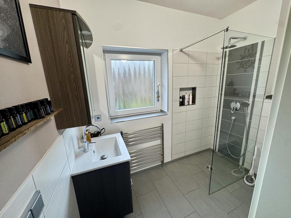 Badezimmer: Grundsaniert im modernen Design mit hochwertigen Sanitärobjekten, Handtucheizkörper und einer bodengleichen Dusche.