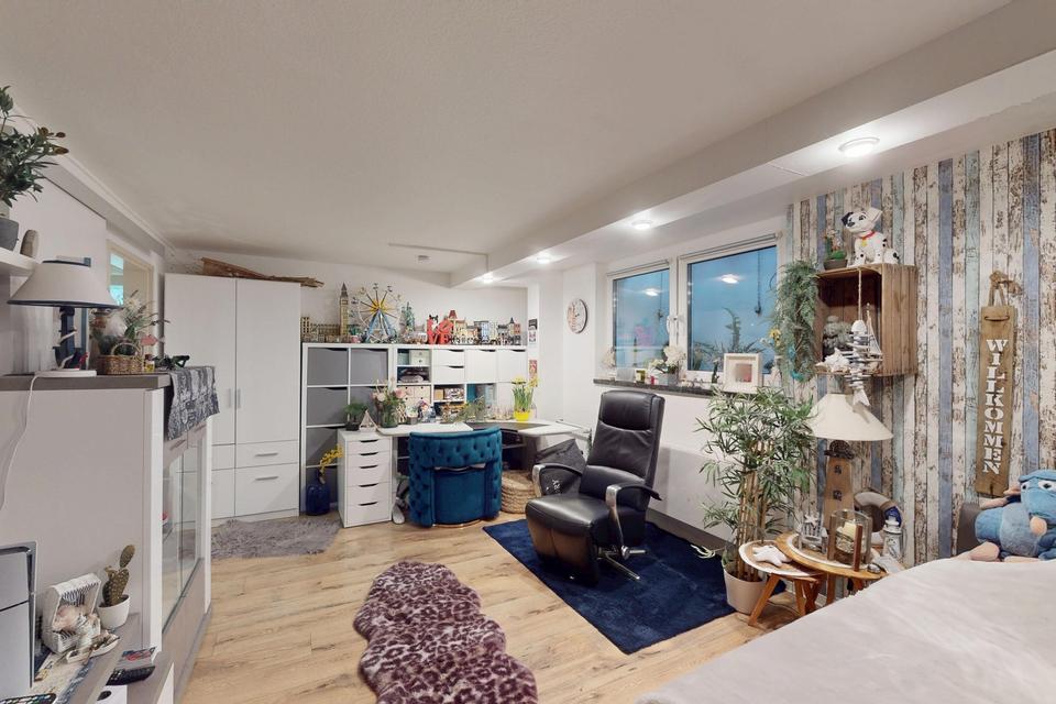 Das Erdgeschoss umfasst ein weitläufiges Wohnzimmer mit Klimaanlage, Dachkuppel und Zugang zur überdachten Terrasse, eine separate Küche mit hochwertiger Einbauküche, ein Büro sowie einen abgetrennten Kinderbereich mit zwei Zimmern und Badezimmer. Ergänzt wird die Ebene durch Diele und Gäste-WC. Im Untergeschoss befinden sich zusätzlich nutzbare Wohnräume (Schlaf- und Gästezimmer) sowie weitere Flächen wie Fitnessraum, Hauswirtschafts-, Heiz- und Technikräume. Alle Räume im Untergeschoss sind beheizt und verfügen über eine gute Raumhöhe.