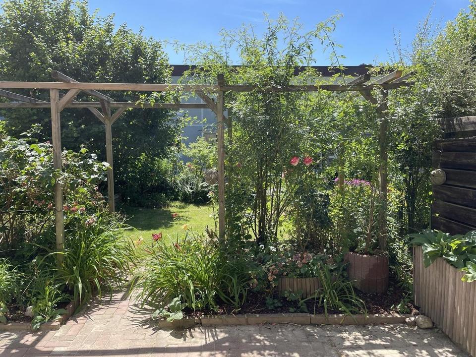 Vom Wohnzimmer aus geht der Blick auf die sonnige Terasse. Hier sitzt man abseits jeglicher Strassen geschützt durch Markise und bewachsene Pergola und kann den naturnahen Garten genießen.