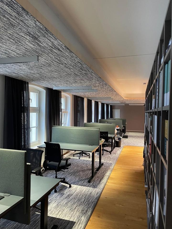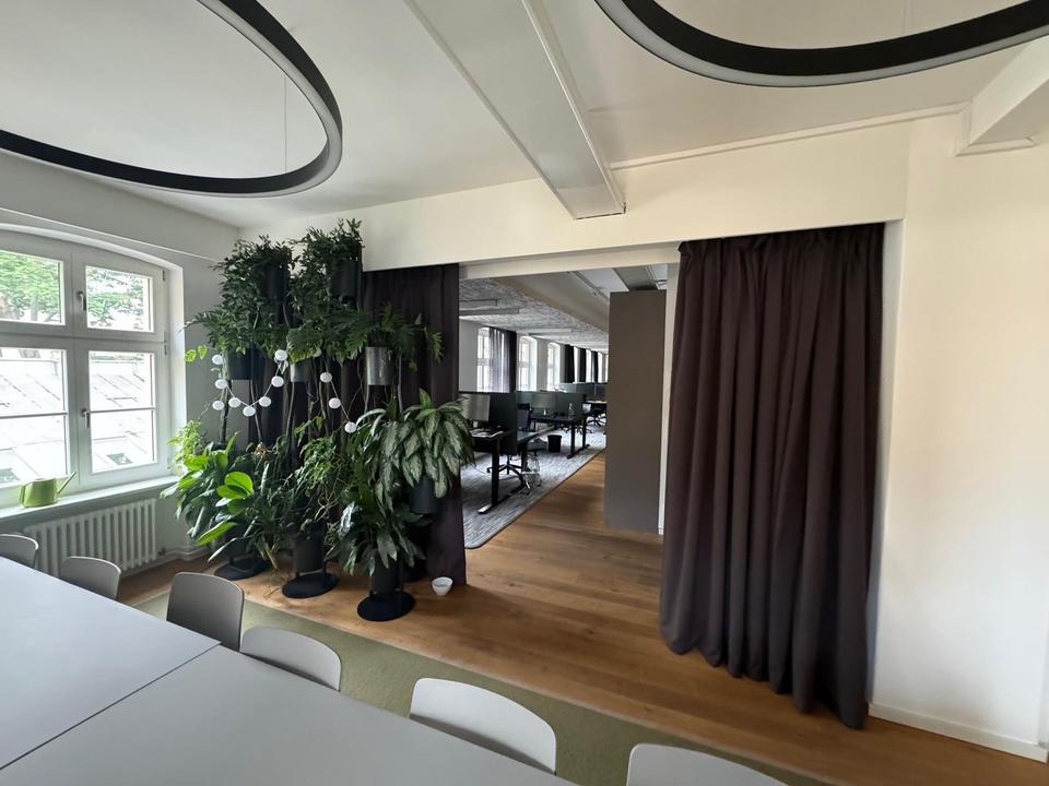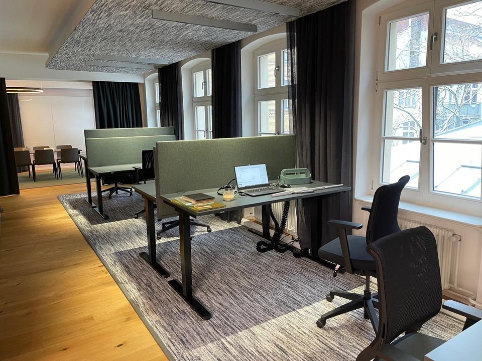 Voll ausgestattes Openspace Office mit 14 höhenverstellbaren Schreibtischen