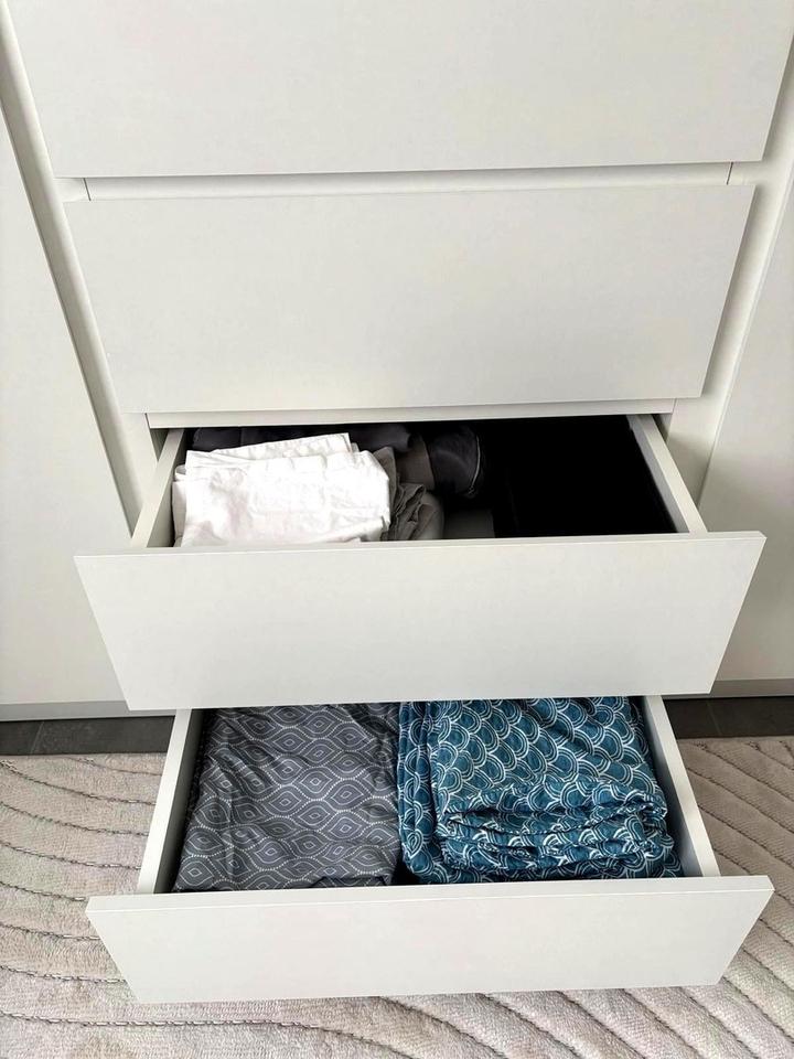 Bettwäsche, Kissen, Decken, Nachttischlampe, Schrank oder Kommode