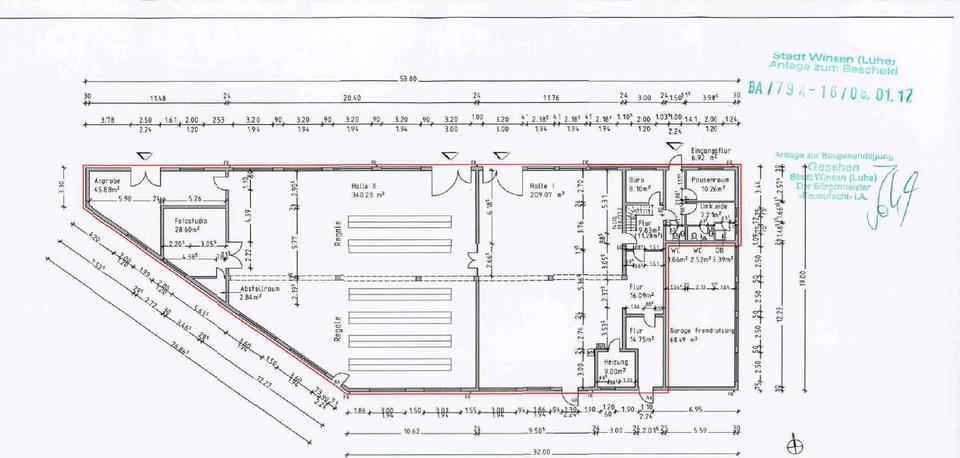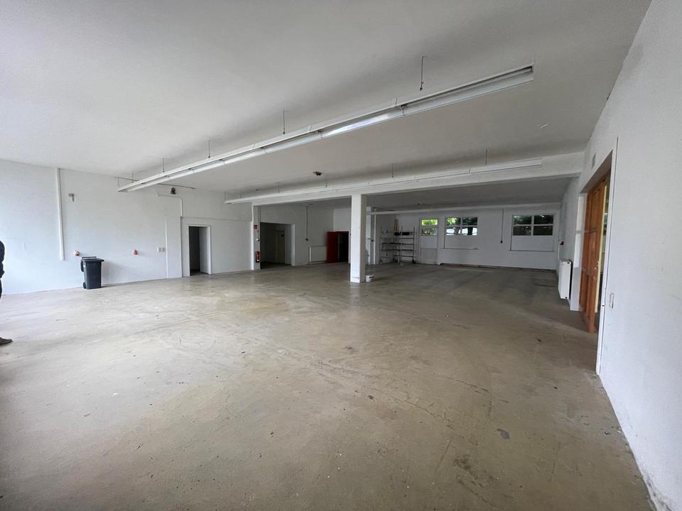 Neben der großzügigen Hallenfläche stehen funktionale Nebenräume zur Verfügung, darunter ein Pausenraum für Mitarbeiter, ein separates Meisterbüro sowie getrennte Sanitäranlagen für Damen und Herren.