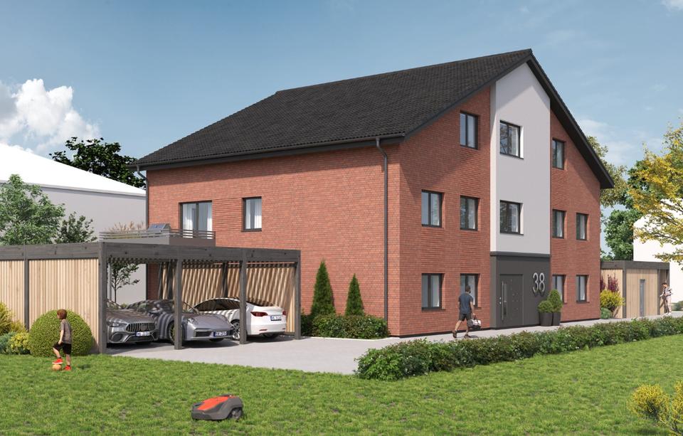 Alle Einheiten sind konsequent auf komfortables, barrierefreies Wohnen ausgelegt: Aufzug, schwellenlose Zugänge sowie bodengleiche/ebenerdige Duschen sorgen für hohe Wohnqualität in jedem Alter. Das Gebäude entsteht als energieeffizienter Neubau nach aktuellem GEG-Standard. Stellplätze sind direkt am Haus vorgesehen; je Stellplatz zzgl. 10.000 € (Carports exklusive). Die Ausstattung kann noch flexibel mit entschieden werden. Egal ob Fliesen in passender Größe oder Farbe oder alternativ in den Wohnräumen auch mit Parkett. Exklusivere Oberböden sind gegen Aufpreis möglich, eine konkrete Baubeschreibung mit genauen Details übersenden wir gern auf Nachfrage. Es gehört eine Fahrradgarage mit der Möglichkeit zum Laden von E-Bikes mit zur Wohnung.