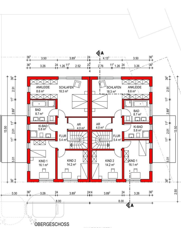 Im Obergeschoss erwarten Sie zwei Kinderzimmer mit eigenem Bad sowie ein großzügiger Elternbereich mit Schlafzimmer, Ankleide und eigenem Bad.