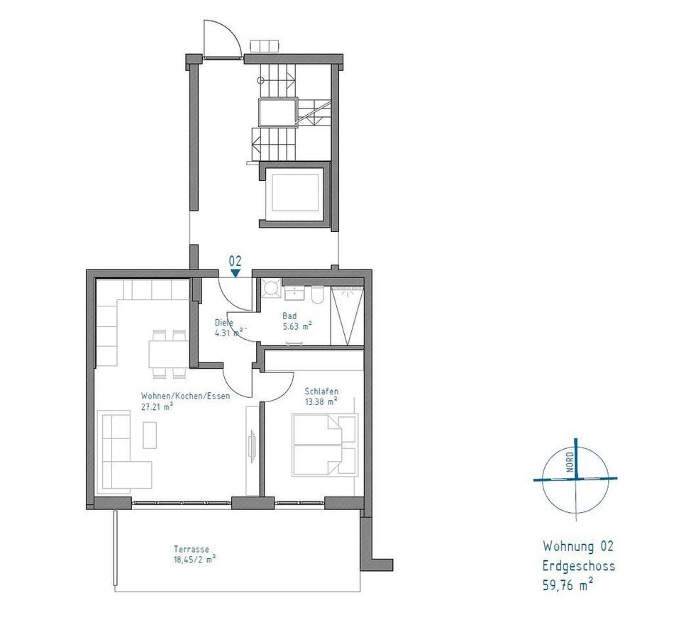 Die angebotene 2-Zimmer-Wohnung (Nr. 2) befindet sich im Erdgeschoss und verfügt über einen großen Wohn-/Ess- und Kochbereich. Sie verfügt über eine großzügige Terrasse mit Garten, die in Richtung Süden ausgerichtet ist.