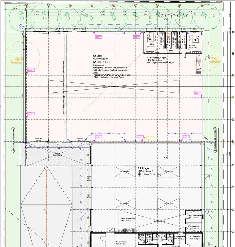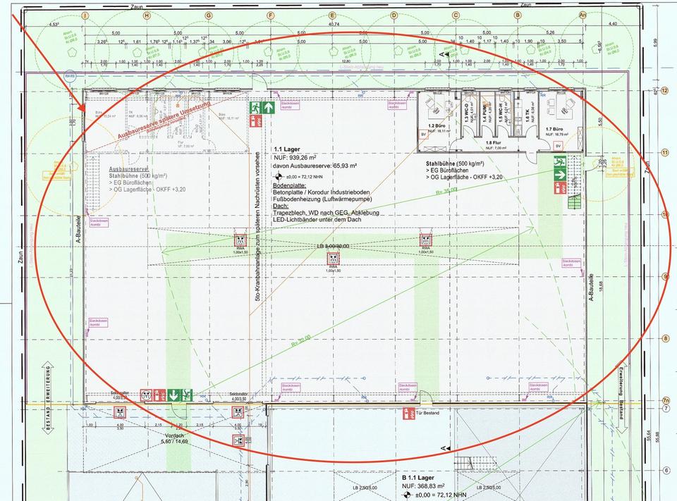 Die Halle bietet eine geplante mittlere Höhe von 9,75 m, wobei die nutzbare Lagerguthöhe auf 7,50 m beschränkt ist, da keine Sprinkleranlage vorhanden ist. Zudem kann die Halle bei Bedarf mit einer Kranbahnanlage ausgestattet werden, was sie besonders für Unternehmen aus dem produzierenden Gewerbe attraktiv macht.